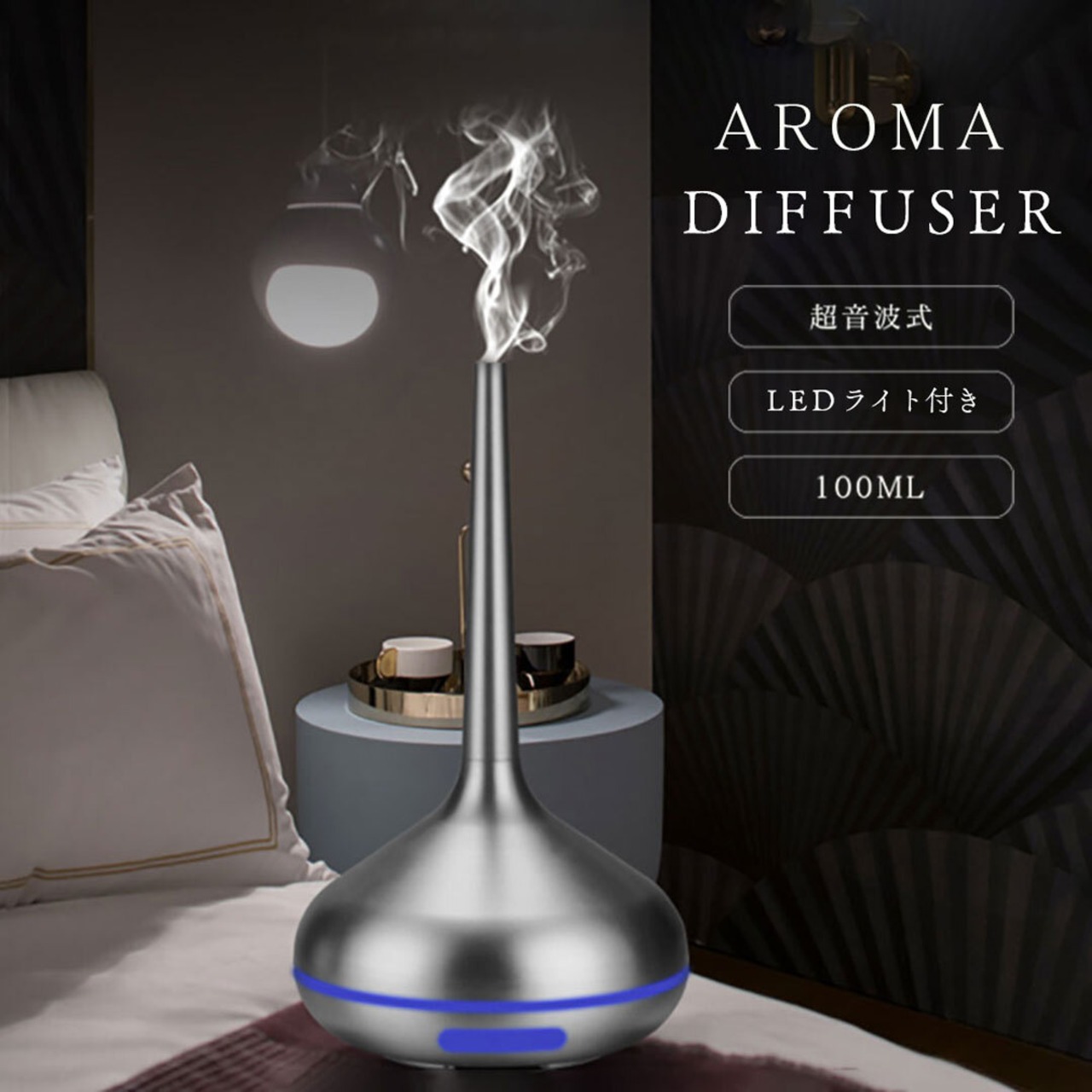 アロマディフューザー 細長 シルバー メタリック LED 照明 ミスト アロマ20%OFF中あと1日!