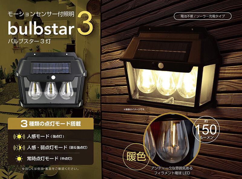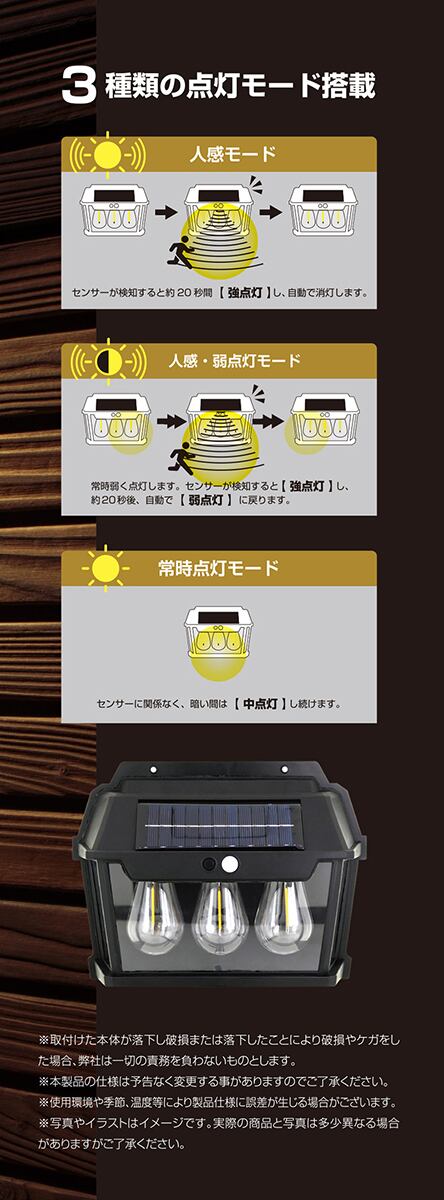 モード:人感モード(強点灯)、人感モード(弱&強点灯)、常時点灯モード(中点灯)