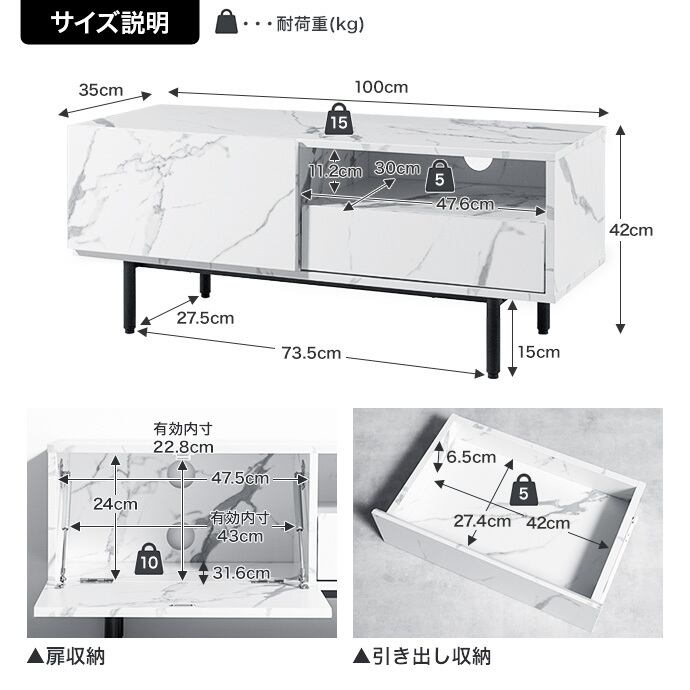 【耐荷重】天板:約15kg、扉収納スペース:約10kg、オープン収納スペース:約5kg、引き出し底板:約5kg