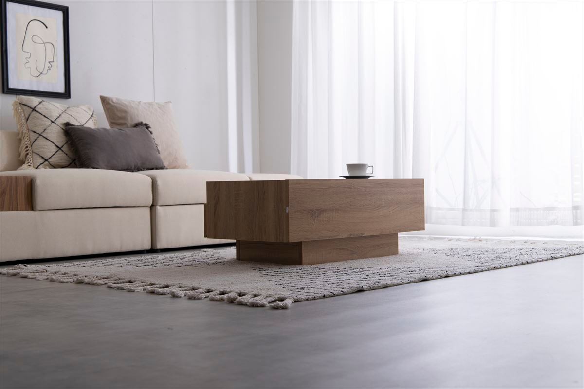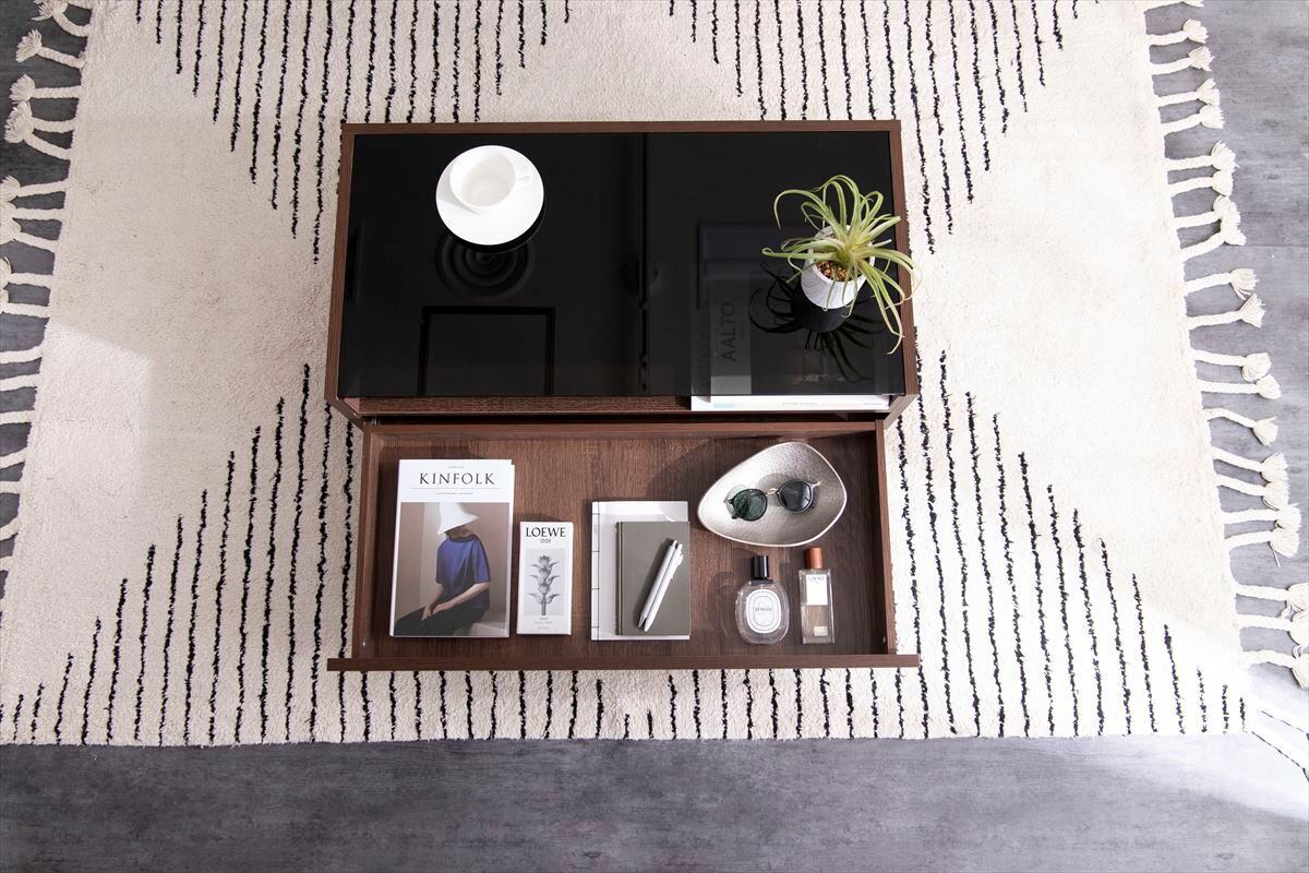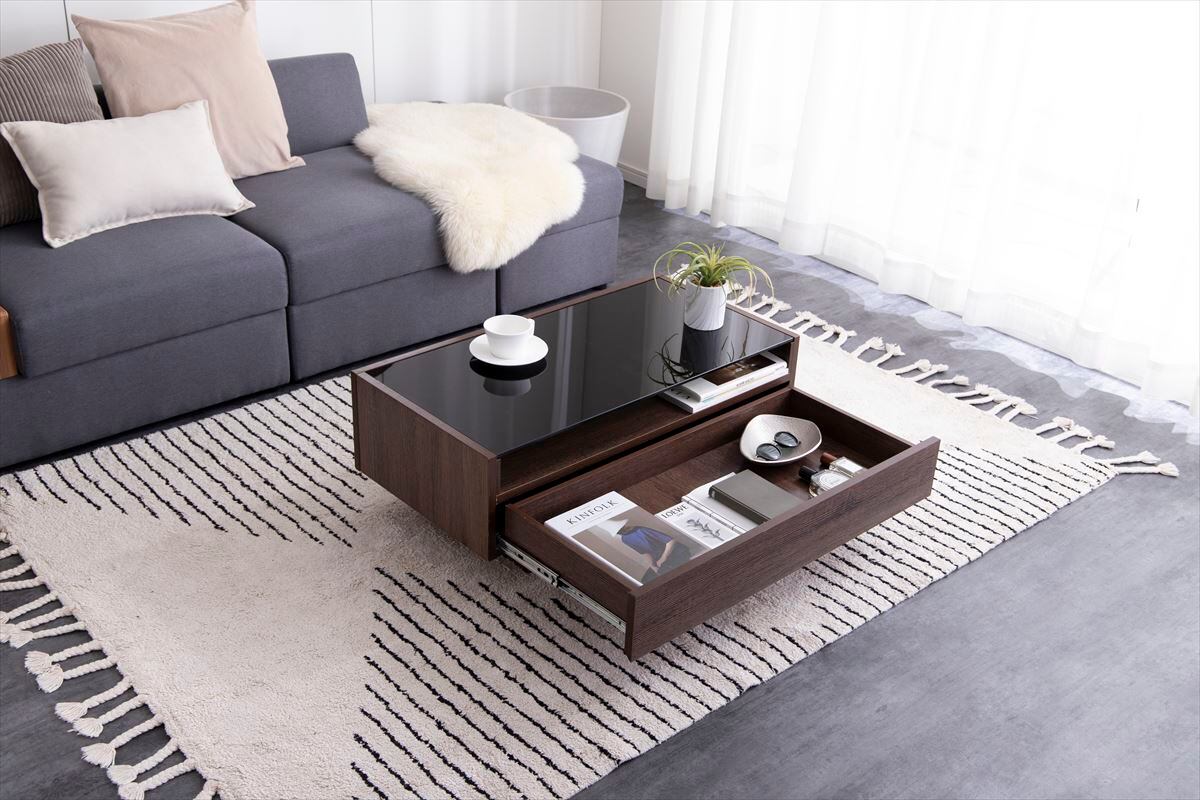 すっきりした見た目と、豊富な収納力を兼ね揃えた『Connie(コニー)』のガラス天板センターテーブル