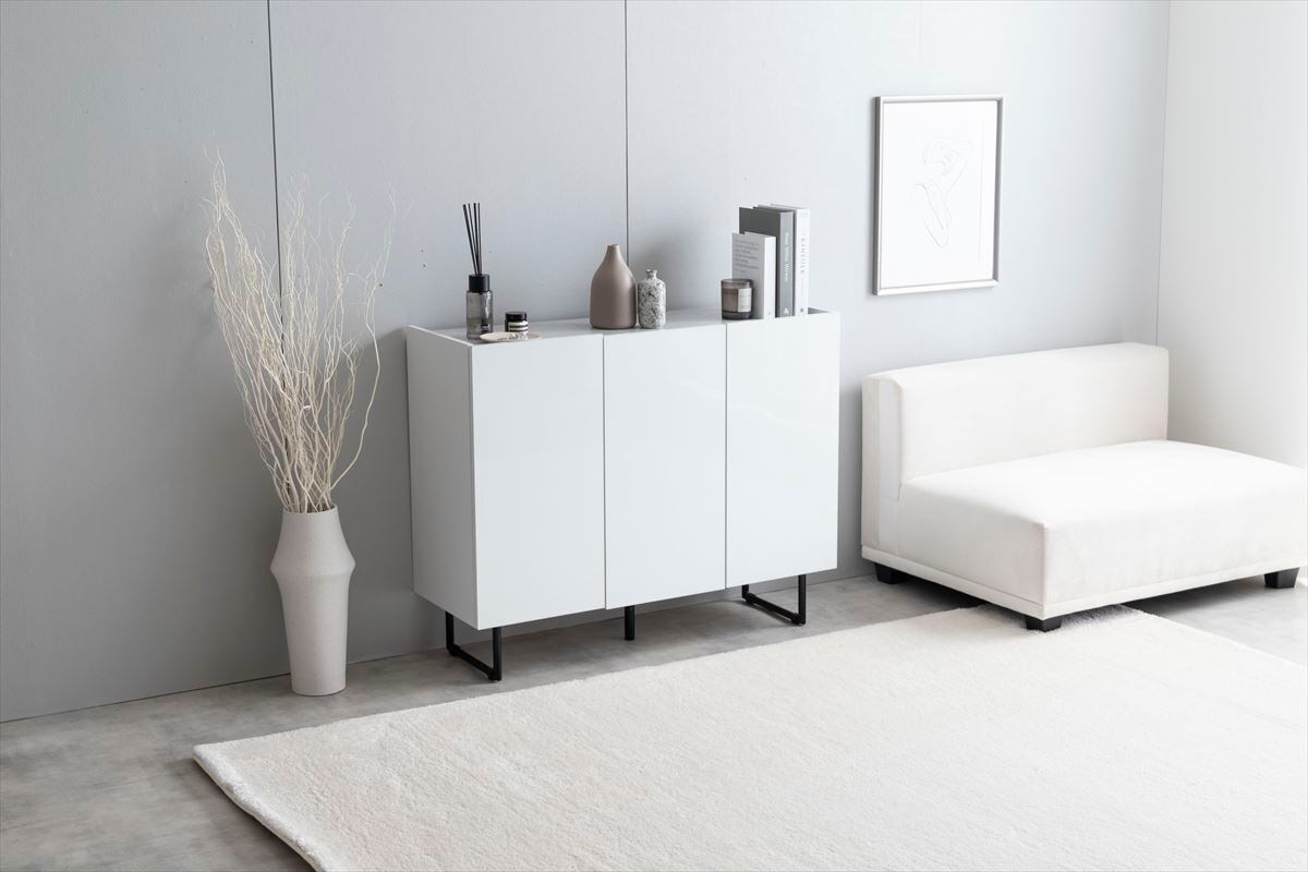 【ホワイト】本体:パーティクルボード、天板:メラミンシート貼り、扉:鏡面貼り、側面:紙貼り