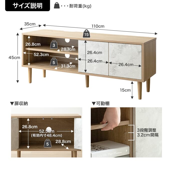 【耐荷重】天板:約15kg、オープン収納スペース可動棚:約3kg、オープン収納スペース下段:約5kg、扉収納スペース:約5kg