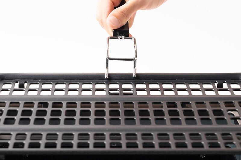 *掴みハンドル付きなのでメッシュプレートとフライパンプレートの交換もラクラク可能です。