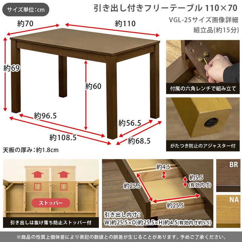 引出し付き フリーテーブル 110×70 BR/NA