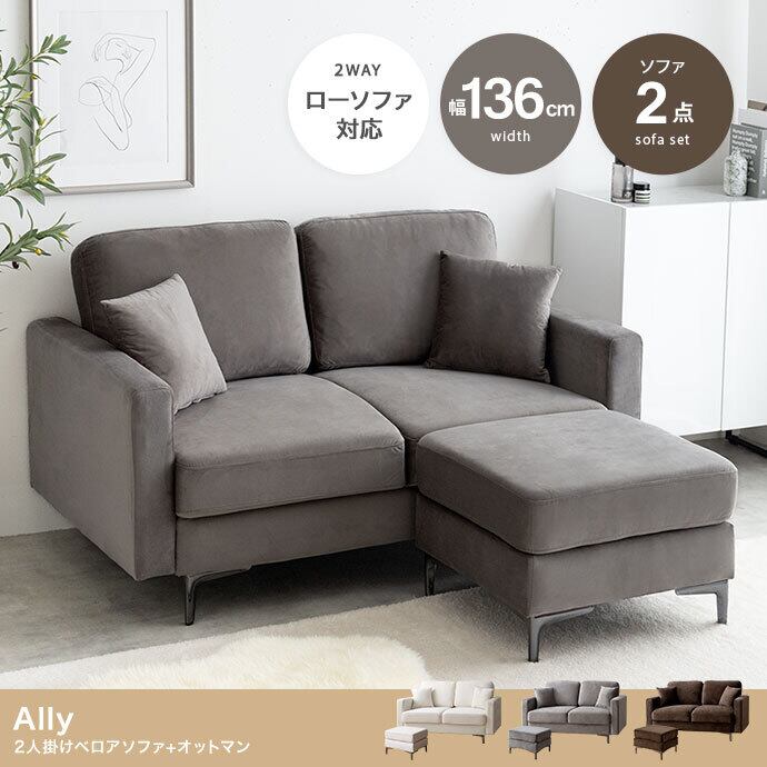 【2点セット】Ally 2人掛けベロアソファ+オットマン