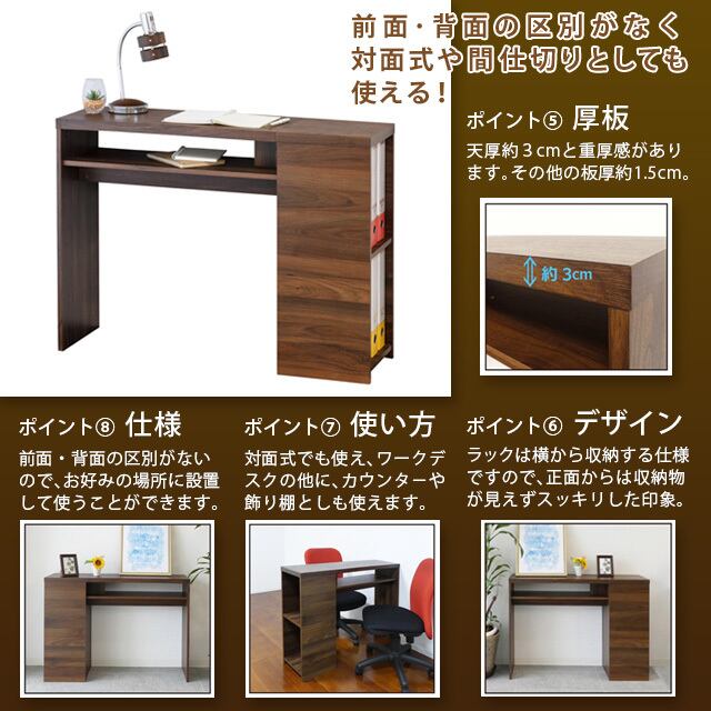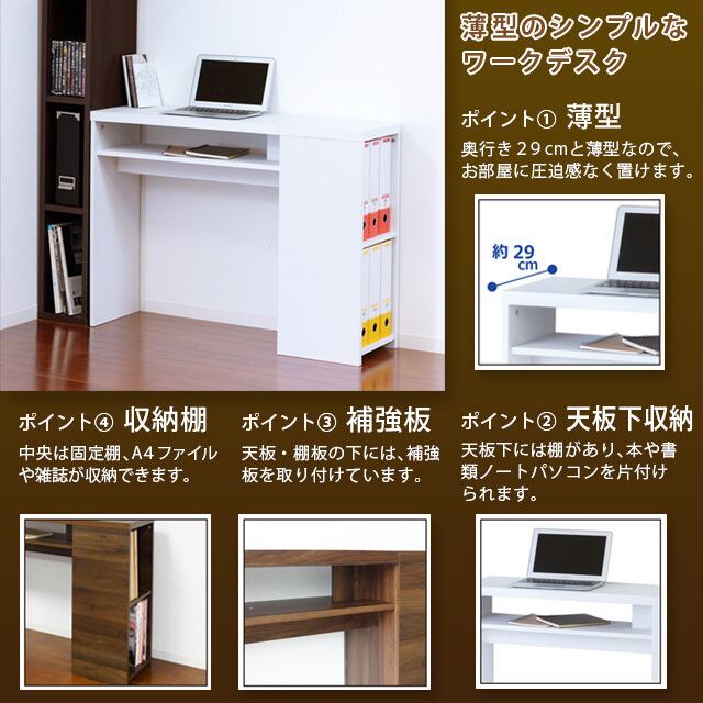 ●天板・棚板の下には補強板を取り付けています。横部収納棚にはA4ファイルや雑誌が収納できます。天板厚約3cmと重厚感があります。