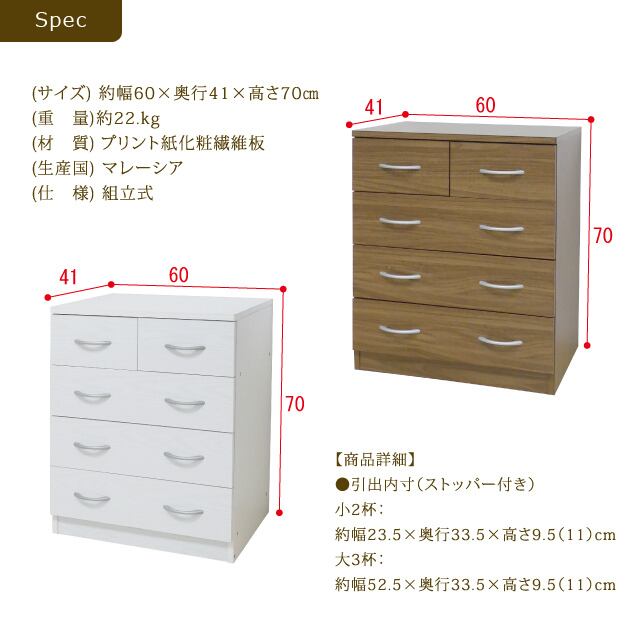 ●大小計5杯の引出しを設けていますので衣類を種類ごとに分けて収納できます。