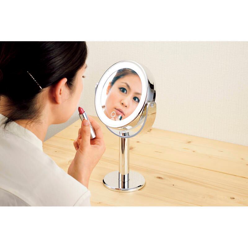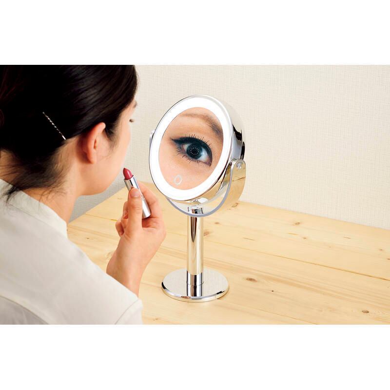 くるっと回転して等倍・5倍の切替ができます。ミラーフレームには眩しすぎず、お肌を美しく照らすLEDライトが内蔵。ワンタッチでライトのON/OFFができます。